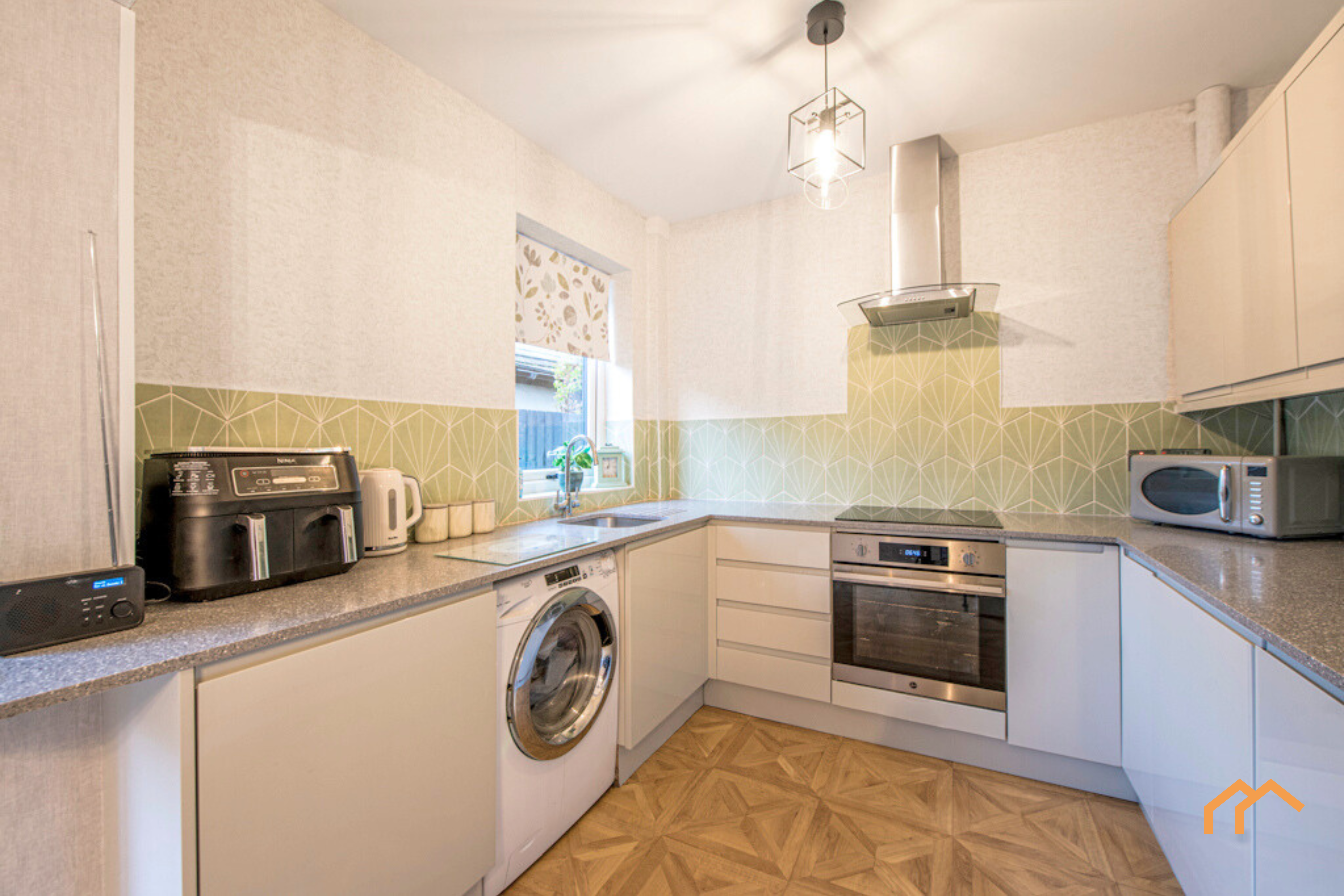 As you arrive, you’re greeted by secure gated access and a spacious driveway providing ample off-street parking. Inside, the heart of the home unfolds in the stunning open-plan kitchen and dining area. With sleek, modern finishes, this versatile space is ideal for family meals, casual gatherings, and hosting dinner parties. Featuring solid stone worktops, integrated fridge and freezer and an induction hob, the kitchen has plenty of space to prepare family meals.