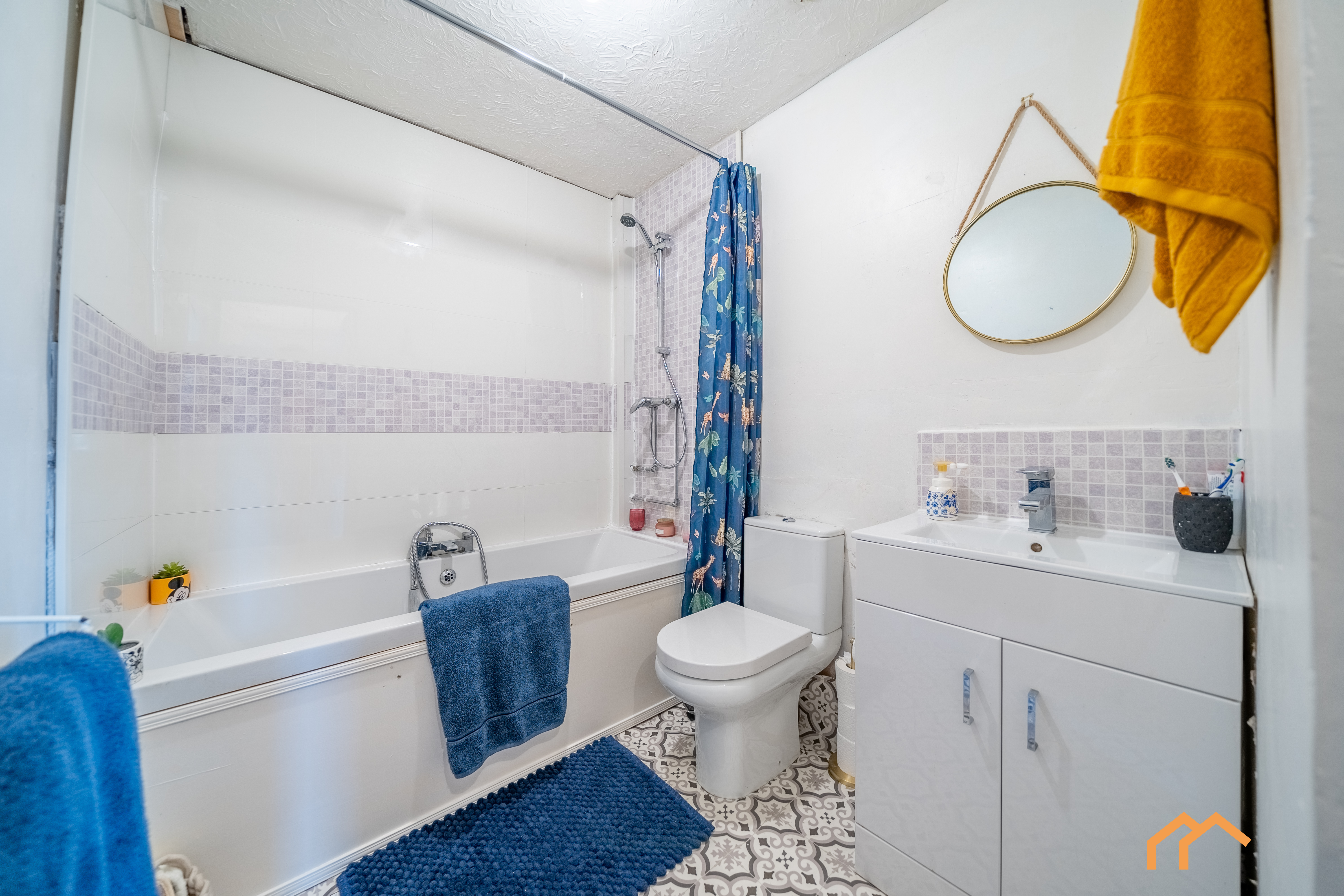 The modern bathroom features an over-bath shower, low-level WC and hand basin with a built-in vanity unit.