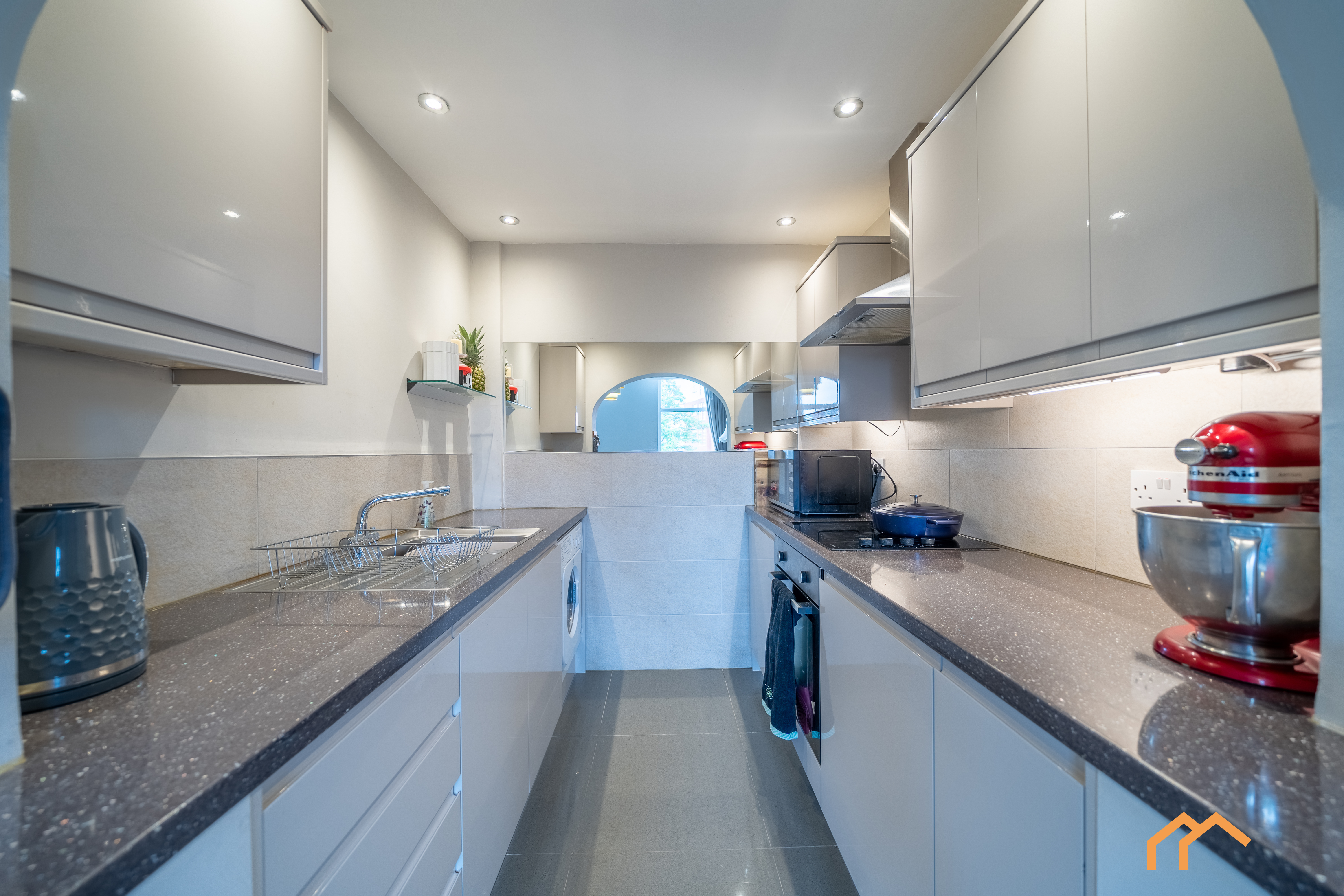 The galley-style kitchen has a range of built floor and wall units providing plenty of storage space. The cooking facilities include an electric hob, oven and chimney-style extractor fan. There is also a stainless steel sink with drainer and the room is lit by in ceiling spotlights.
