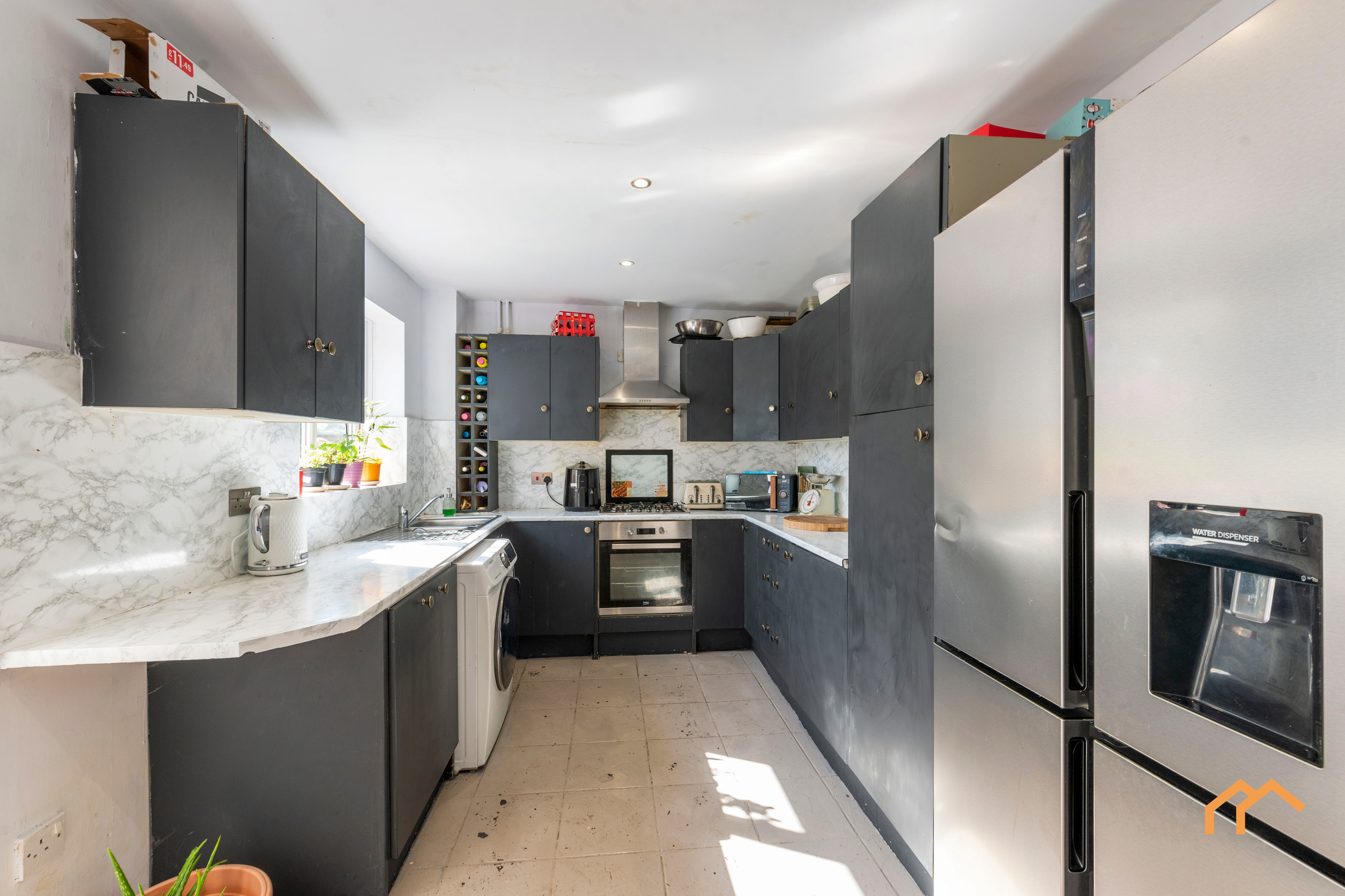 The kitchen/diner features a range of wall and floor units, including space and plumbing for a washing machine. There is a gas hob, electric oven, hood-style extractor fan and space for an American-style fridge freezer. Stone effect worktop and splashback finish the kitchen.