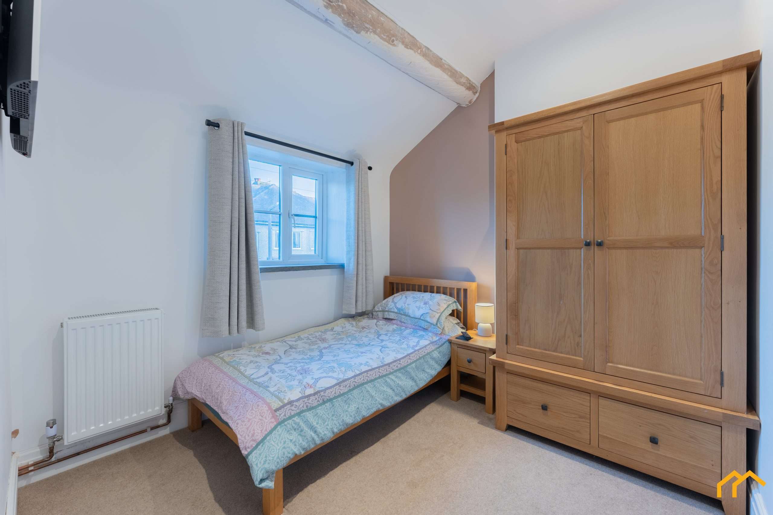 The master bedroom is finished in a neutral décor and benefits from built-in wardrobes and exposed beams. The second bedroom is a well-designed single room, featuring clever access into the eaves for storage. This room also displays the ship’s mast which formed part of the original construction, and enjoys views towards the river.