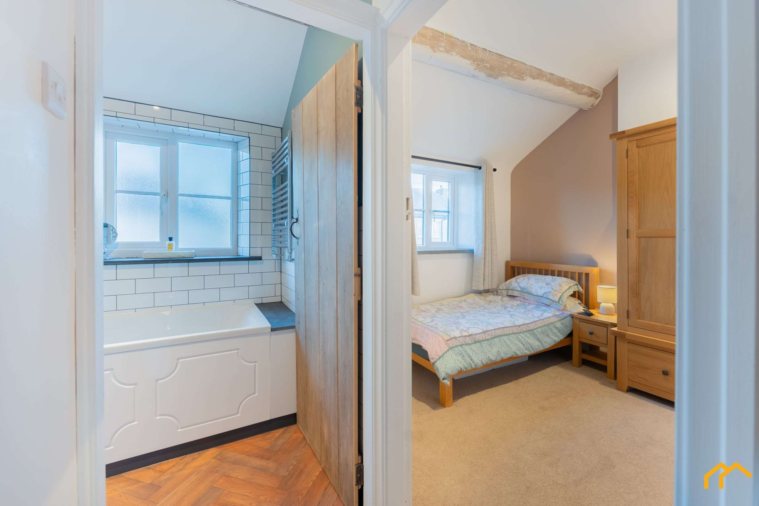 The bathroom has been fully transformed and now features a stylish Burlington suite, including a back-to-wall WC, floating pedestal basin and bath with shower over. Matt white wall tiling and herringbone flooring complete the space beautifully.