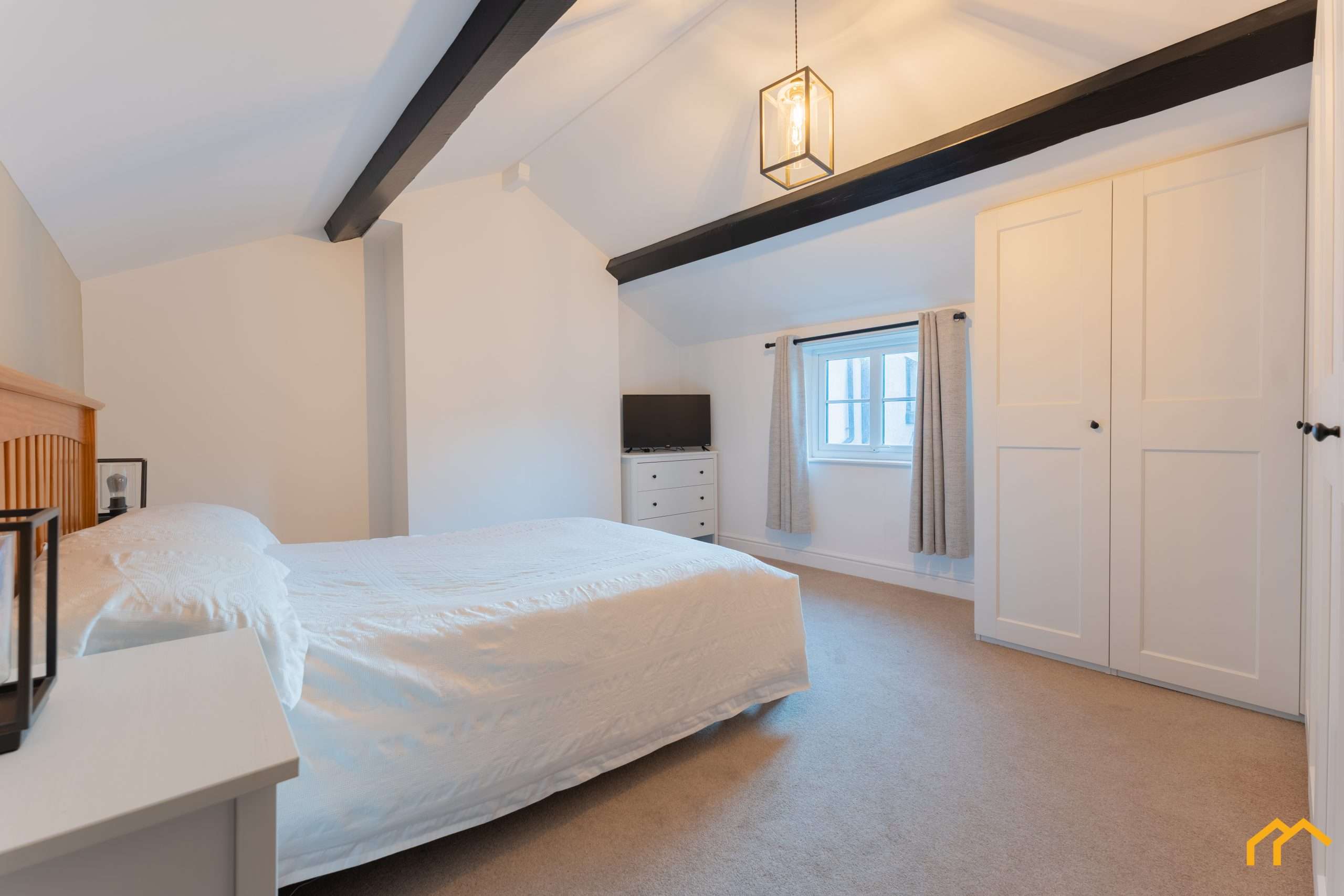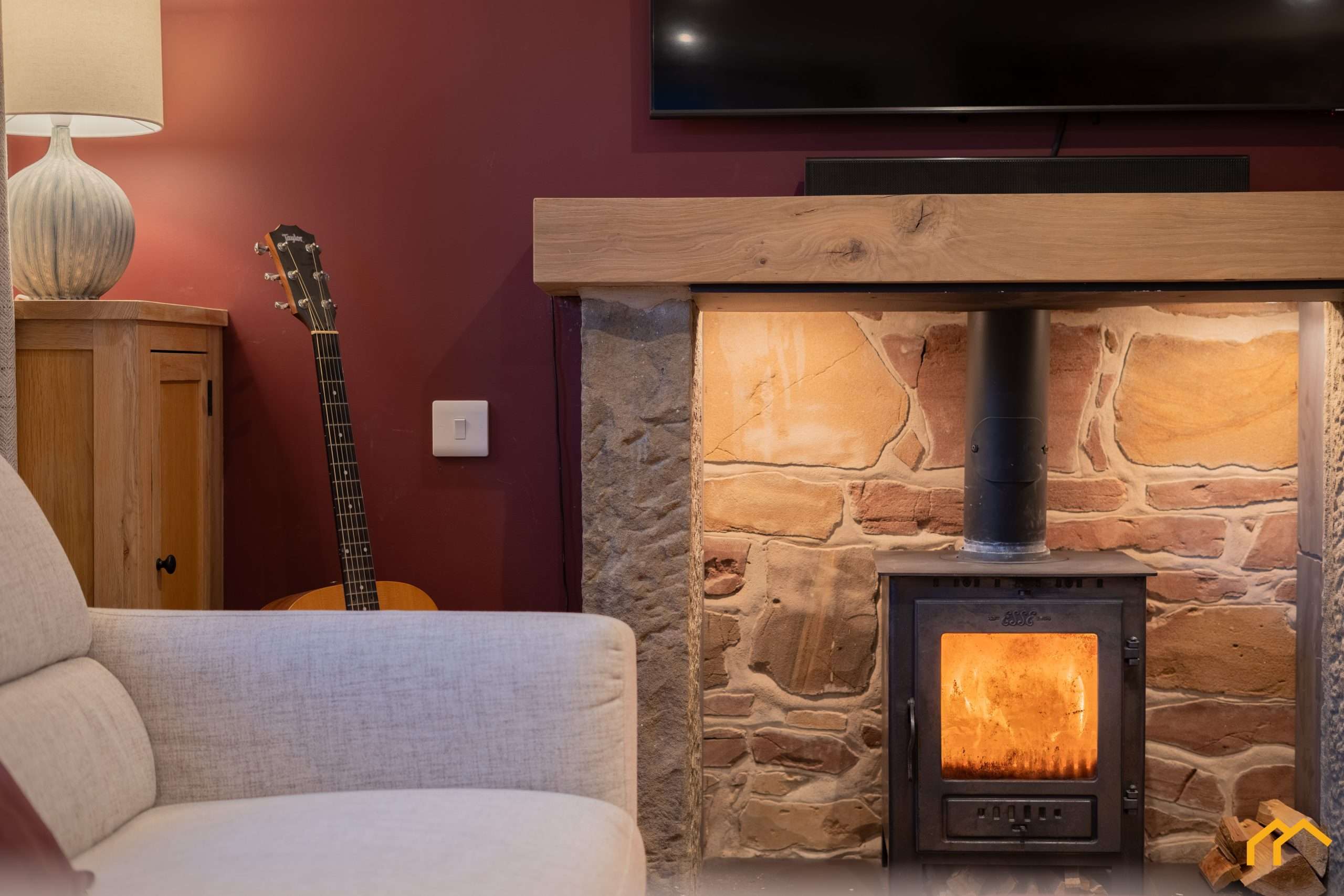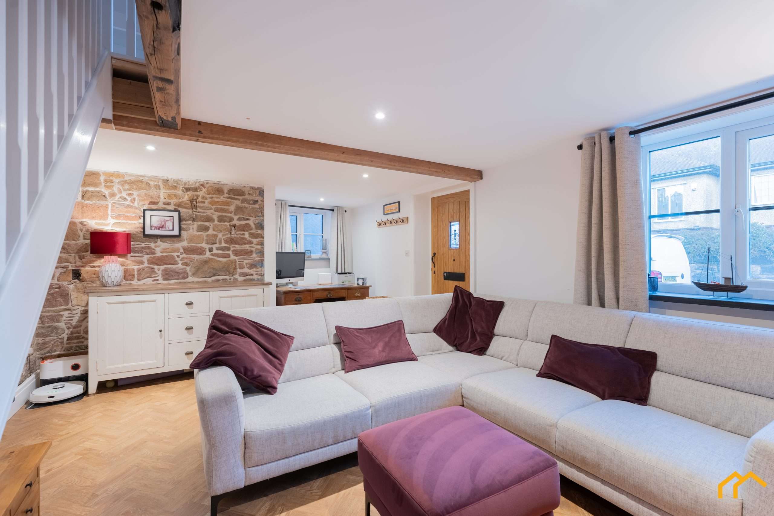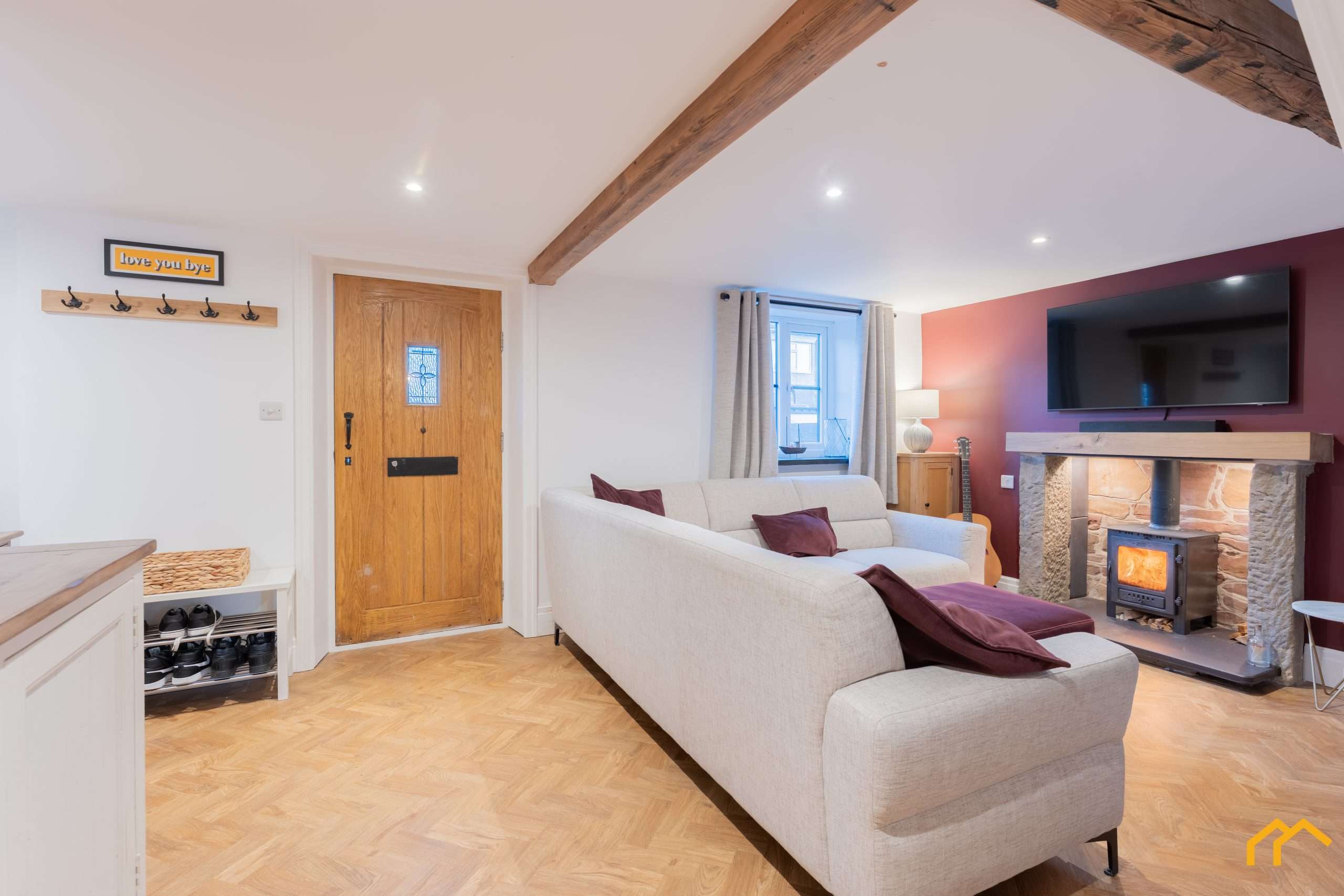 Upon entering, you are welcomed into the inviting lounge. This space has been taken back to brick and fully re-plastered, with new windows installed and a striking feature fireplace with log burner creating a warm focal point. A sandstone feature wall showcases the original construction of the cottage, complemented by exposed beams that further enhance the period charm. In addtion to the log-burning stove there is also underfloor heating, seamlessly blending modern technology with the character and charm of this historic cottage.