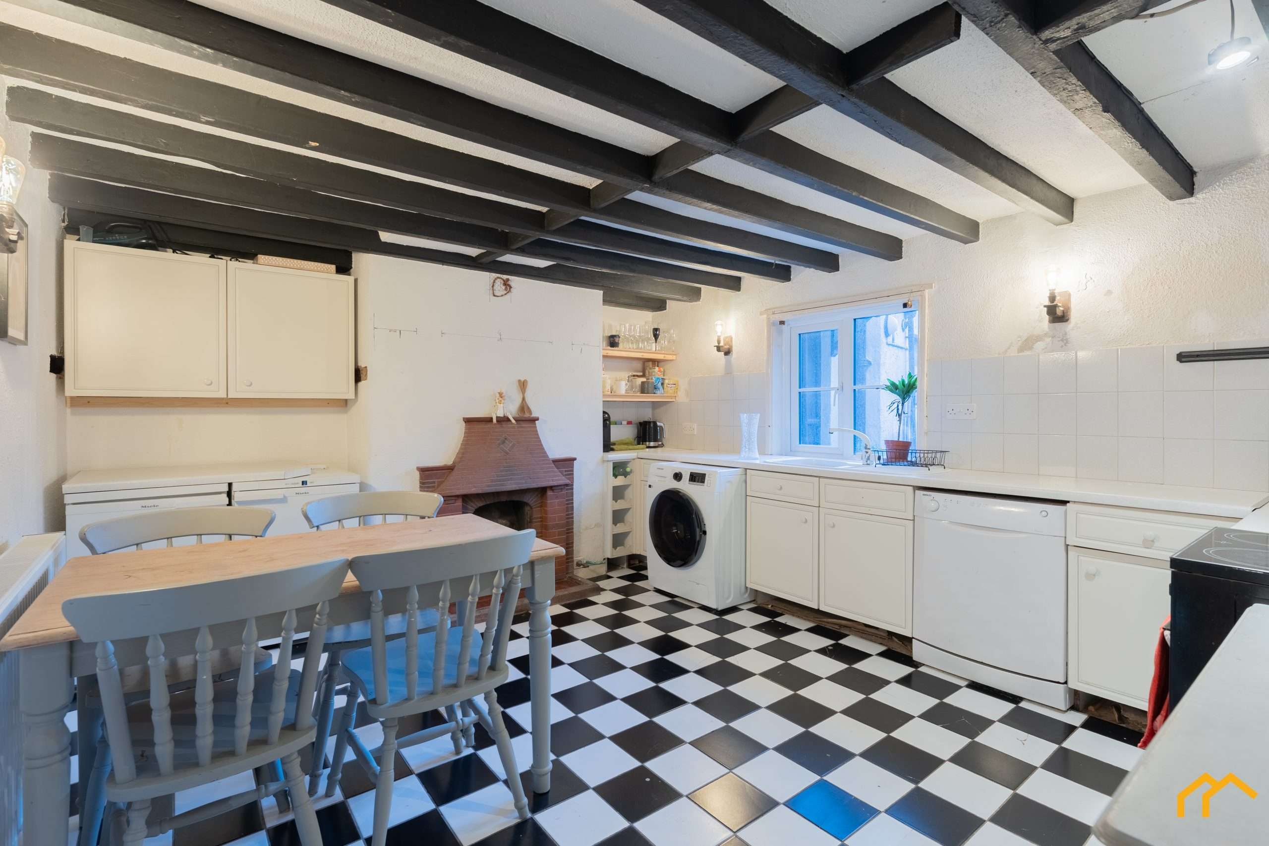 The kitchen offers an opportunity for a new owner to personalise the space to their own taste. It provides access to the rear courtyard and includes a range of wall and floor units, space for utilities, a traditional fireplace and exposed beams.