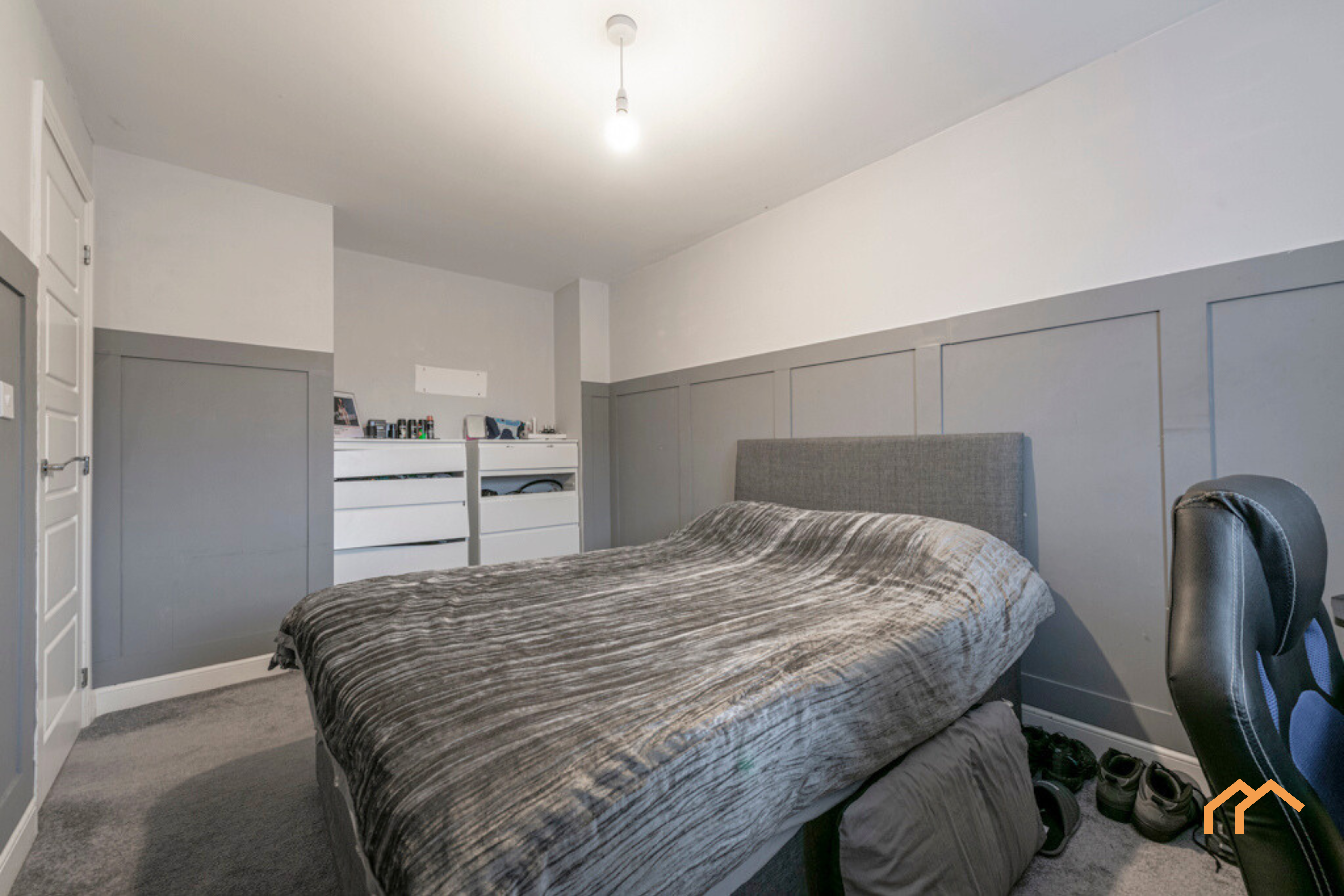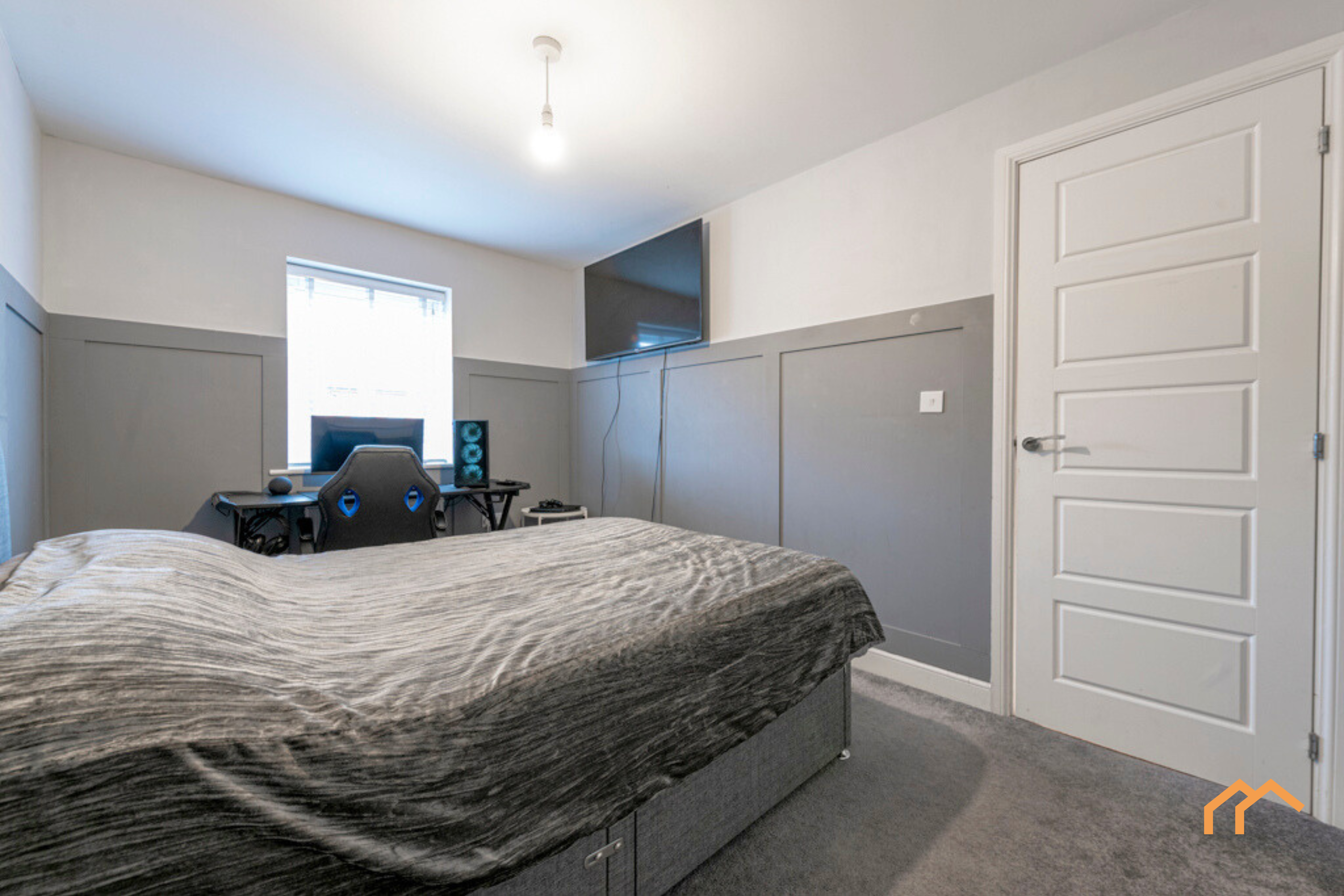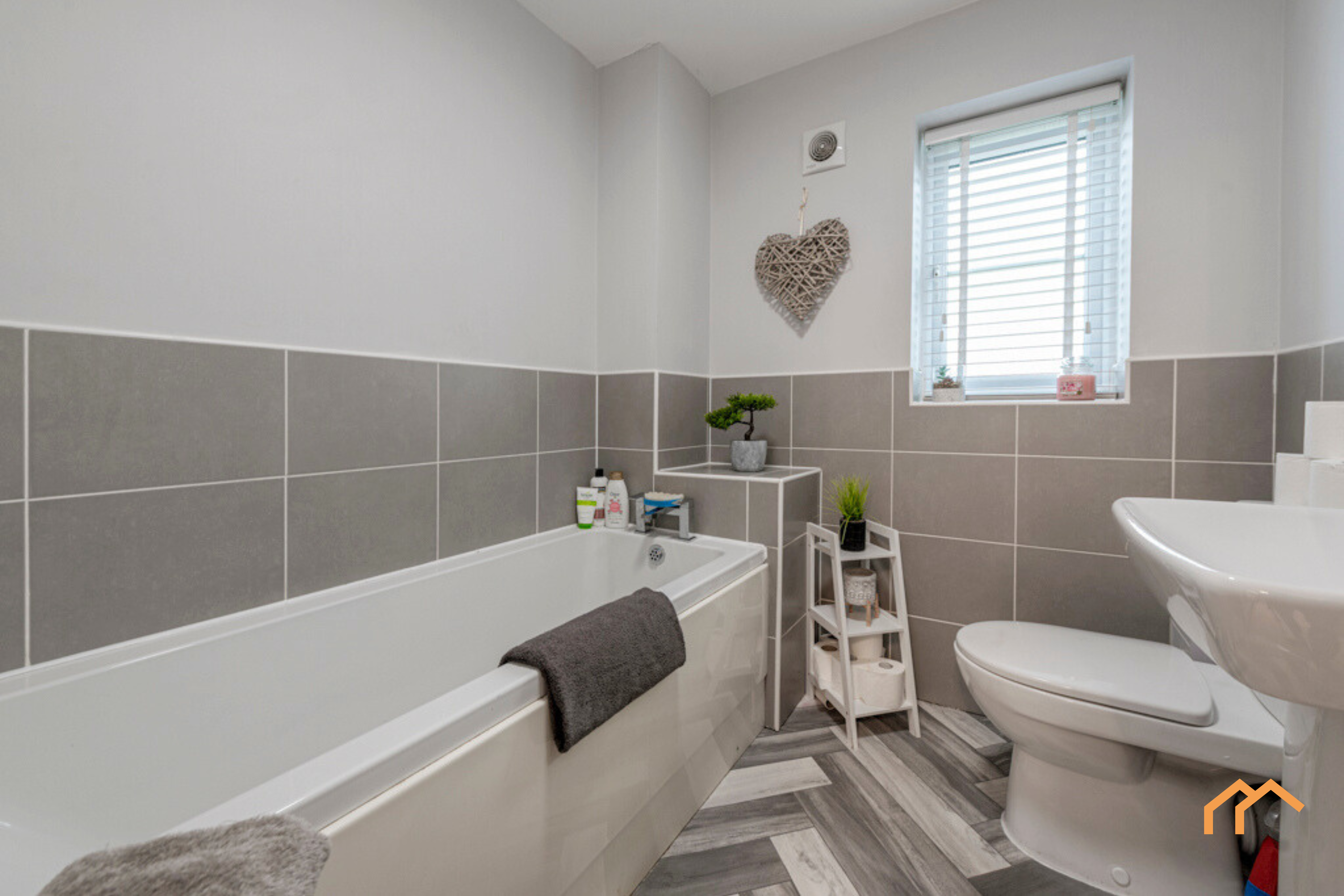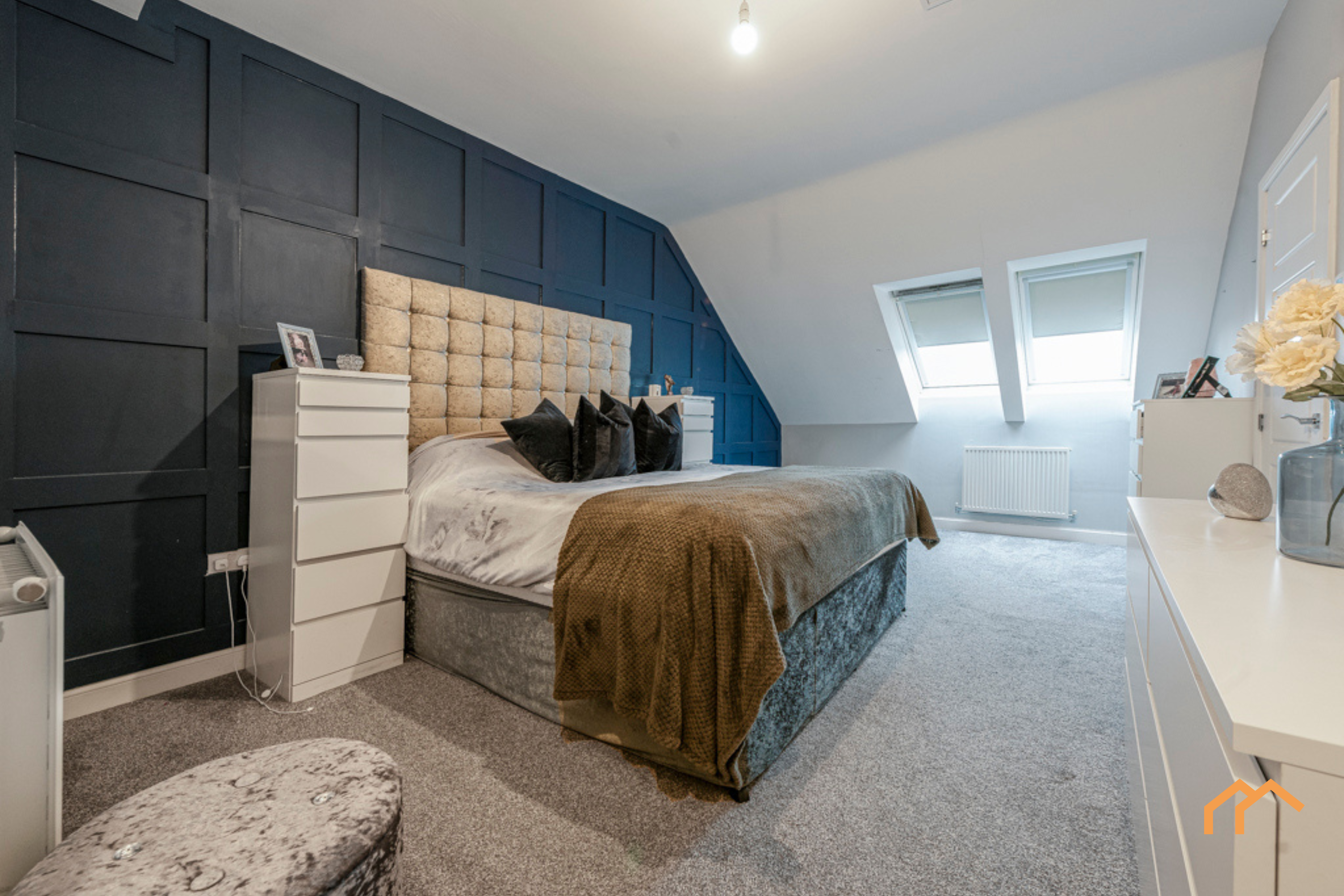 Bedroom three currently has a single bed but could easily fit a double in it. As with the other bedrooms, there is feature wood panelling on the walls and the decor is neutral. This room also benefits from built in wardrobes. A double glazed window overlooking the front of the property and central heating radiator finish the room.