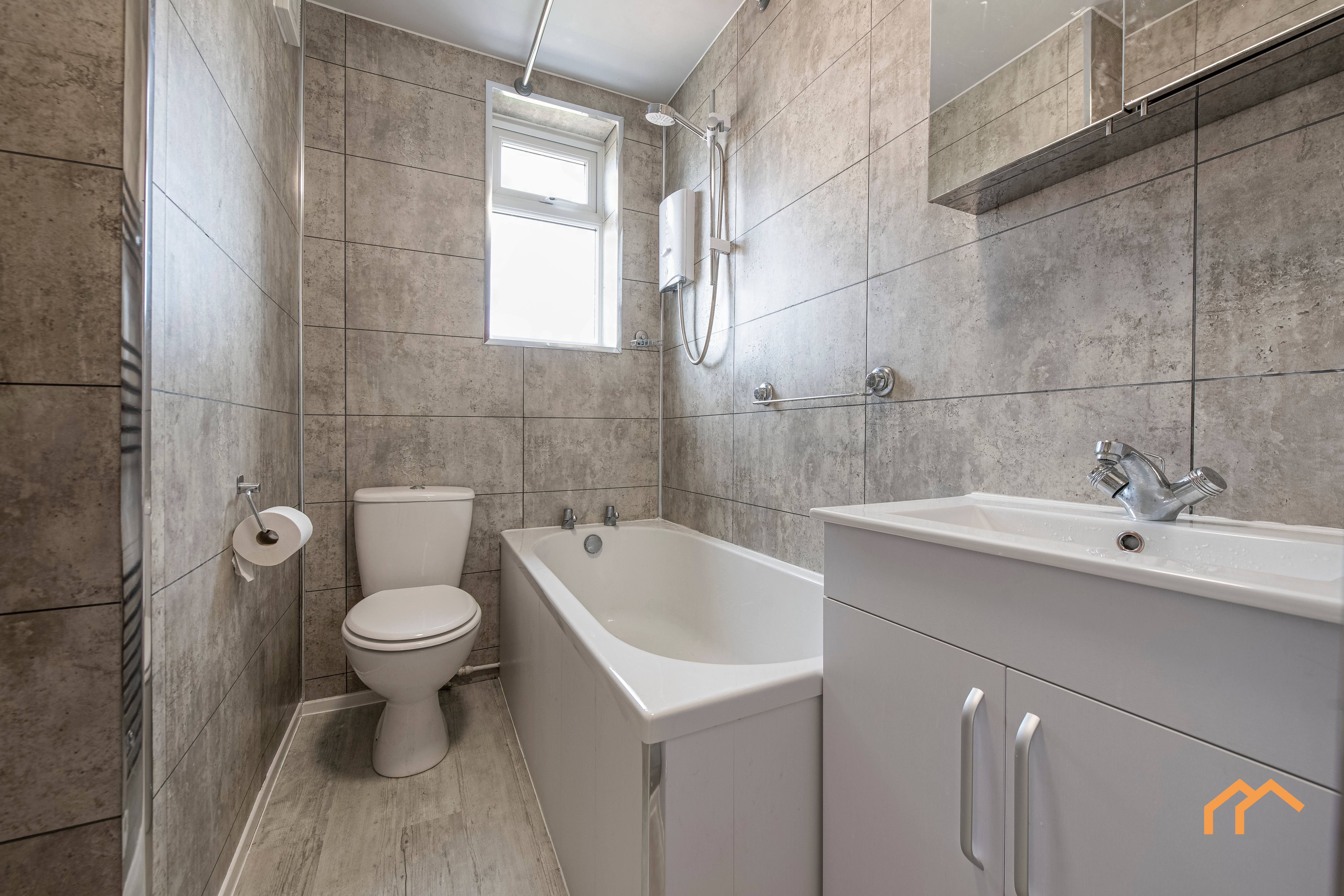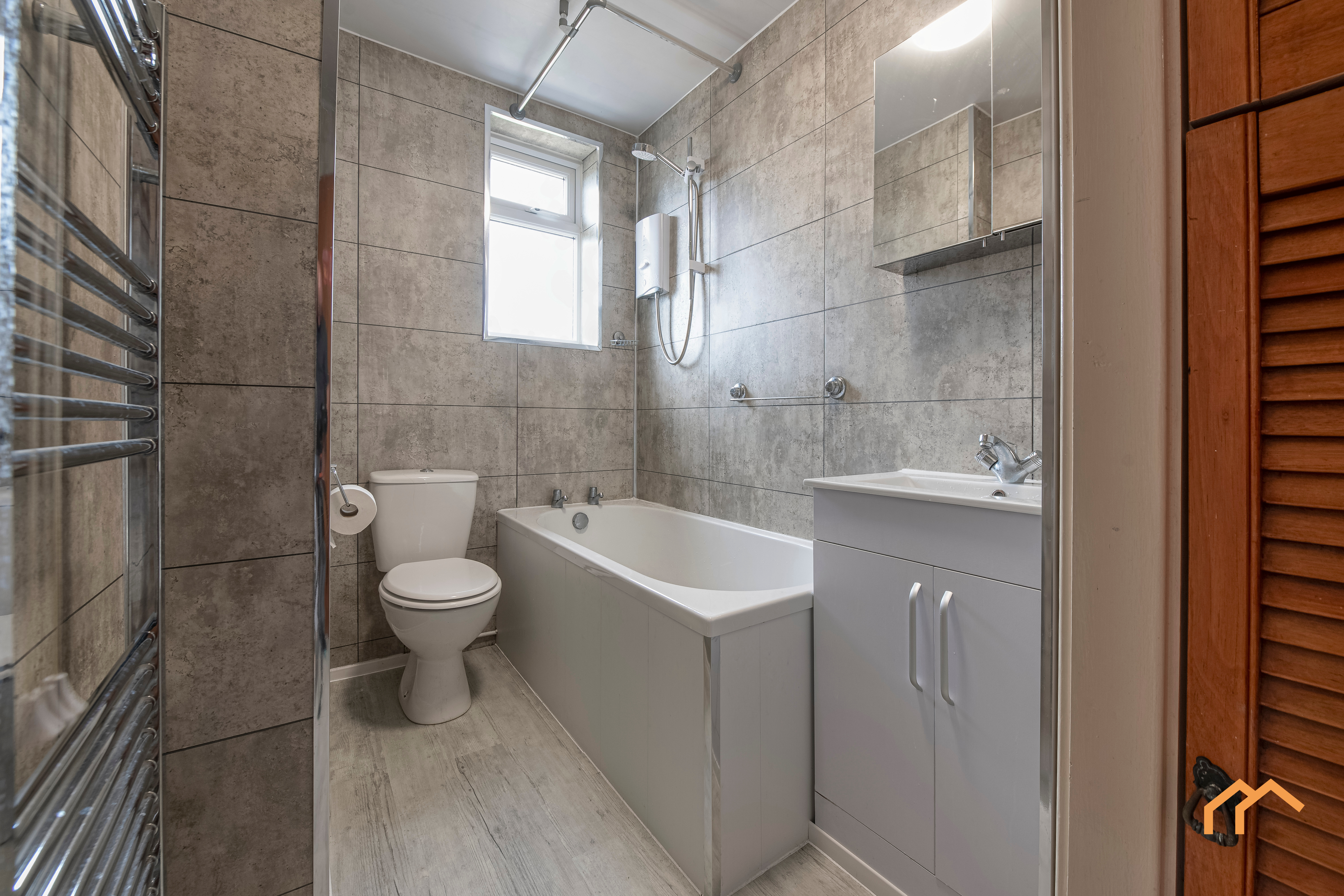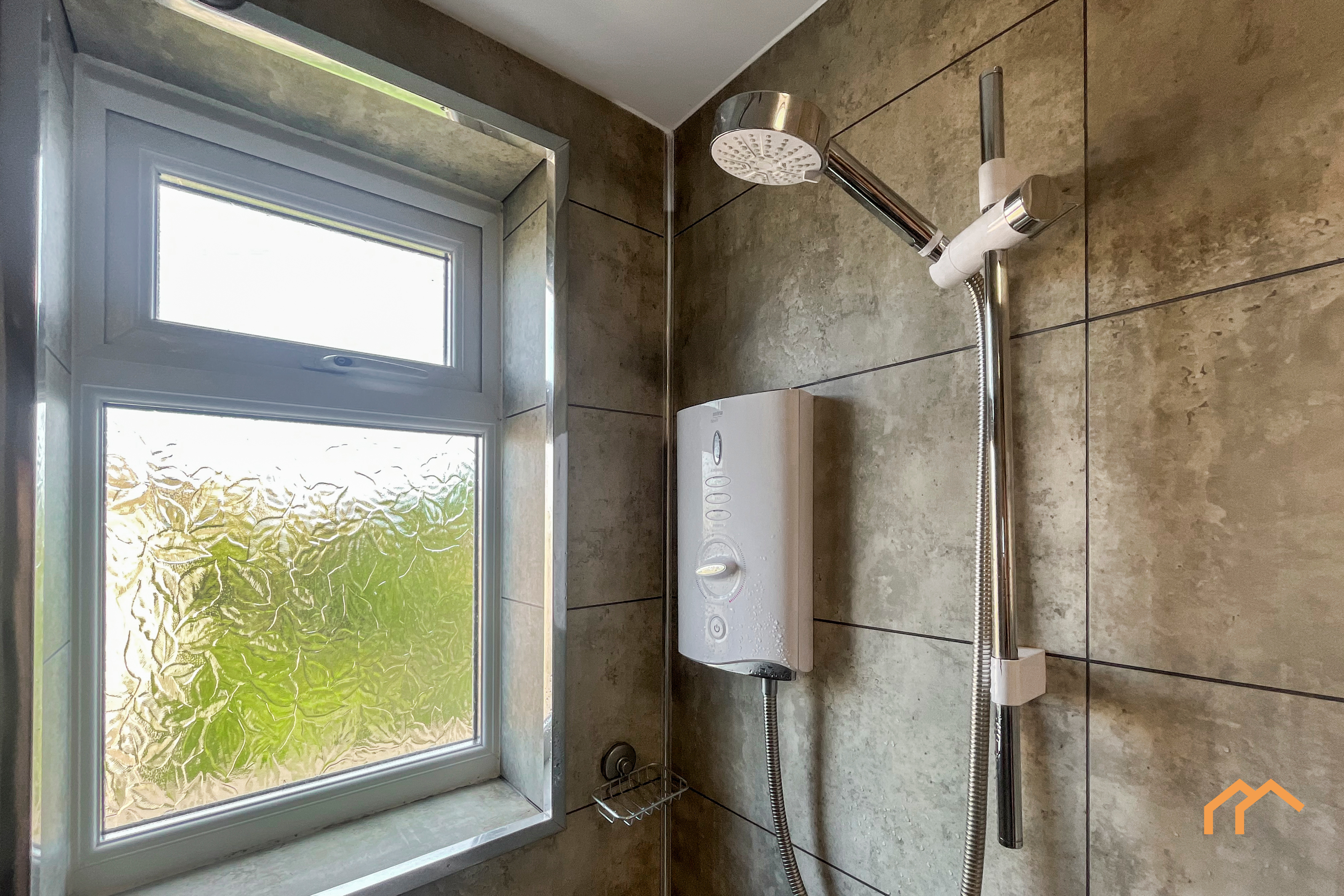 The bathroom is finished in a stylish neutral colour palette and features a shower over bath, low-level WC and hand basin. There is also a cupboard housing the hot water tank system.