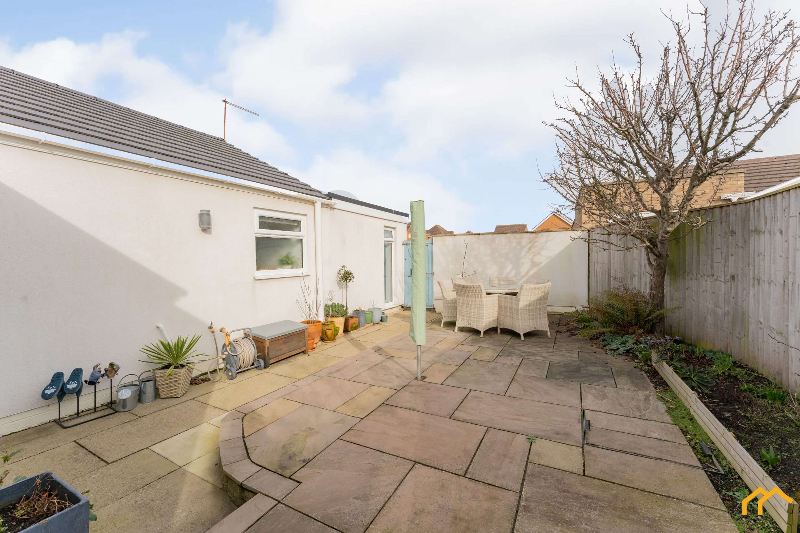 The property sits on a generous plot, offering off-road parking and with further space available to potentially construct a detached garage, subject to the relevant planning permissions. To the rear, there is a low-maintenance, private patio garden accessed from the living space. South-facing and finished in Indian stone, this area is perfect for alfresco dining and entertaining.