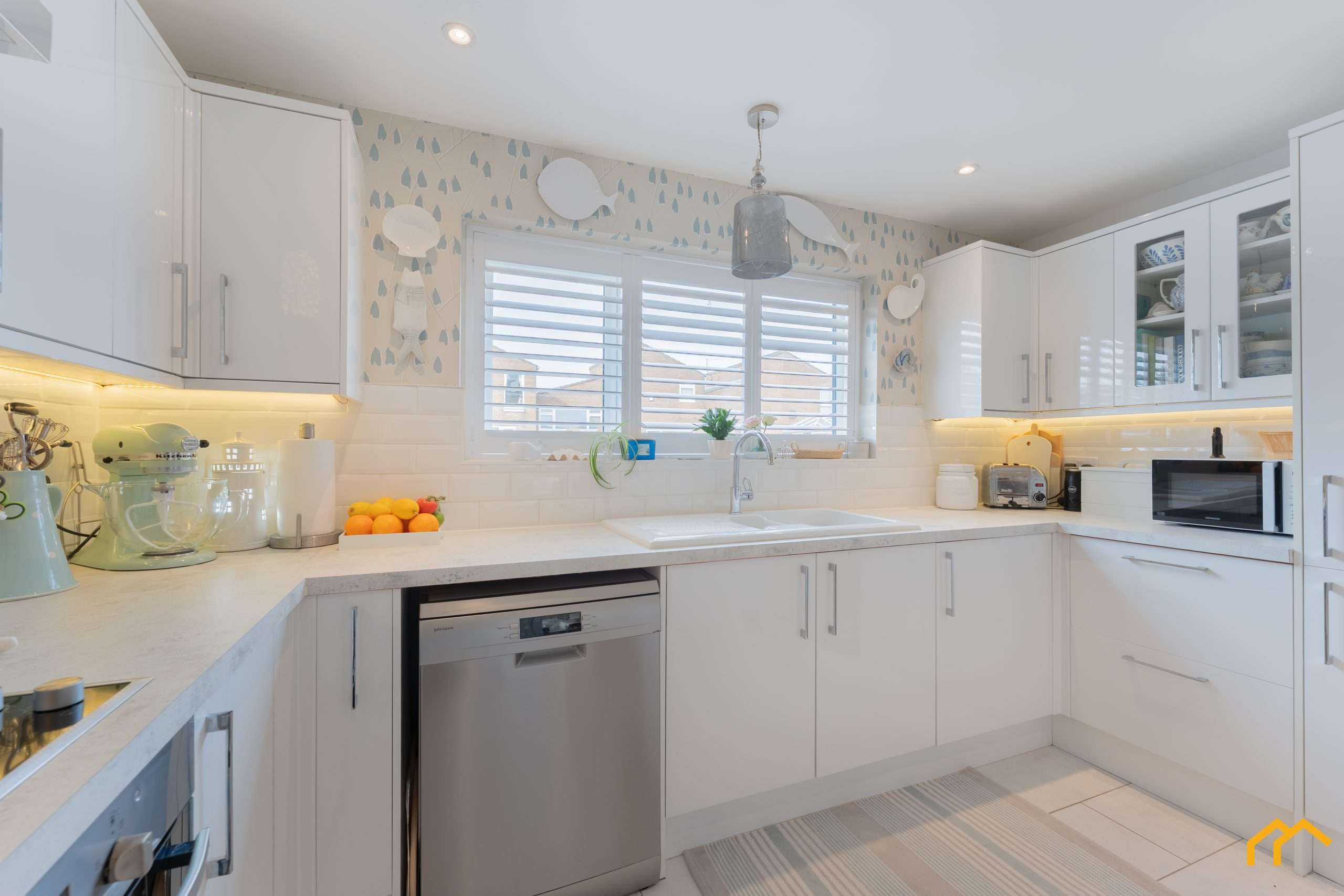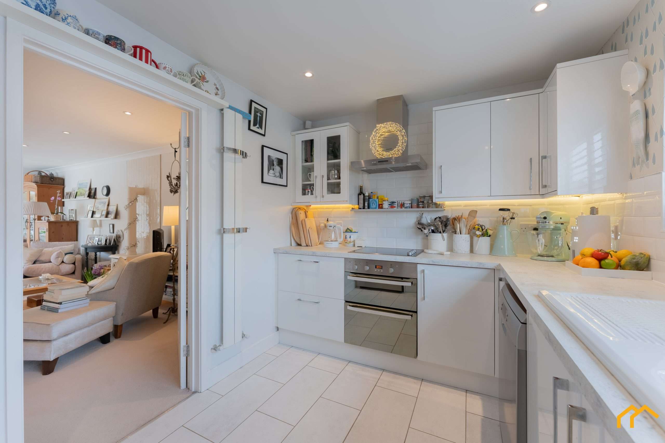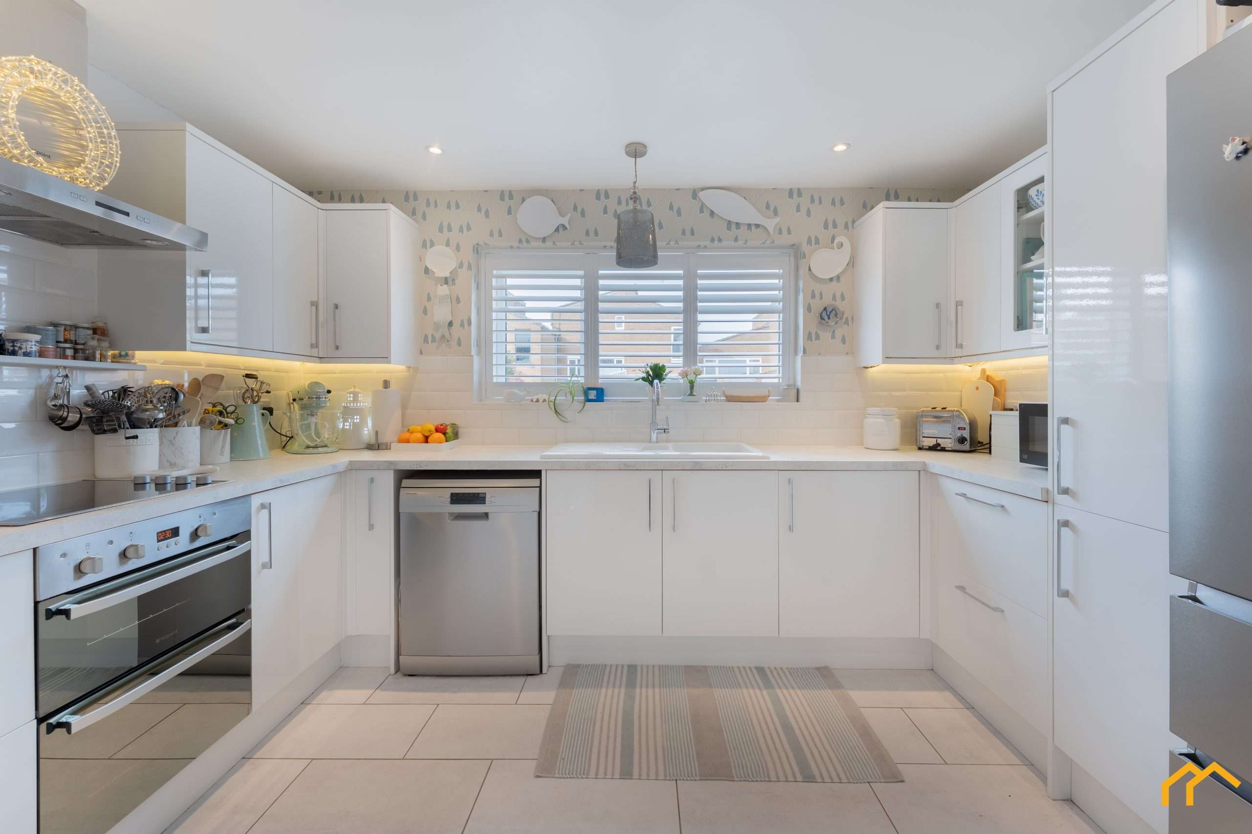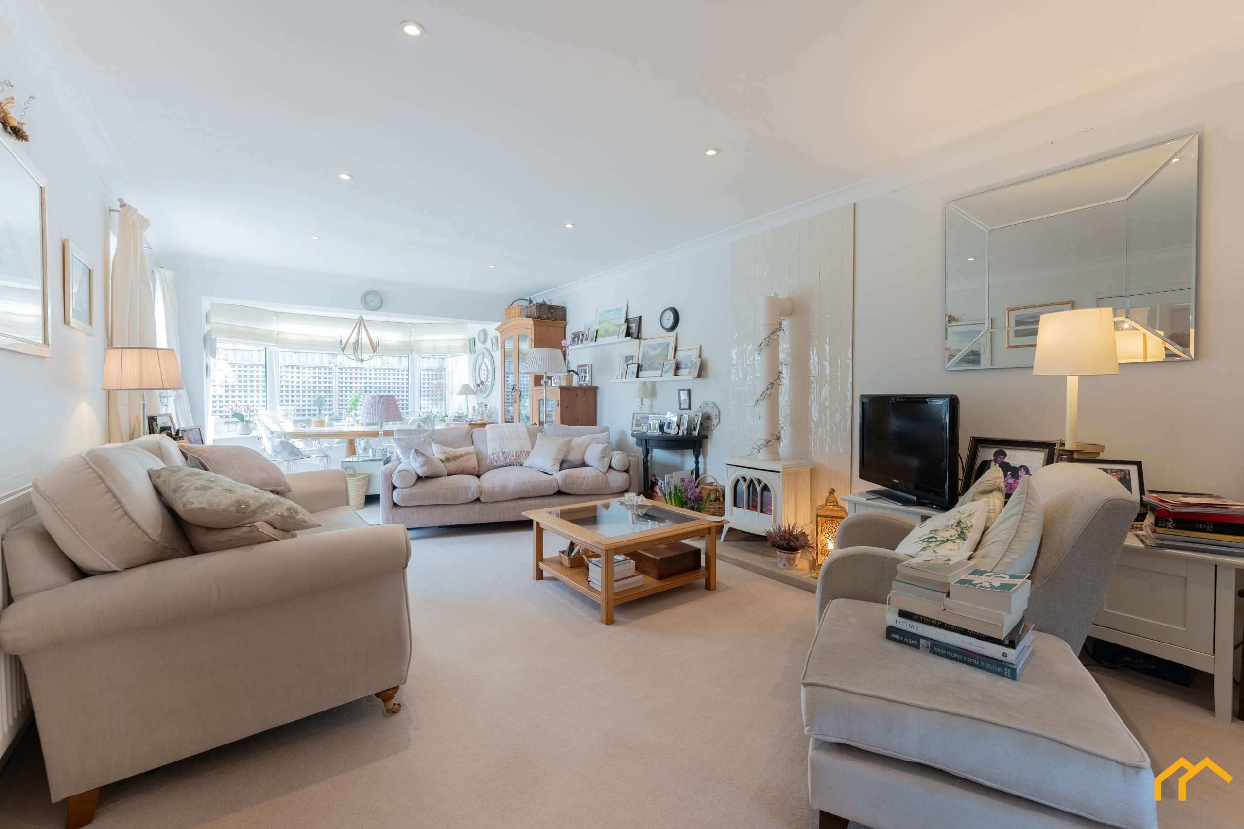 Upon entering the property, you are greeted by a welcoming hallway. Off this is the large open-plan living and dining space, with the dining area enjoying views over the garden and benefitting from a large bay window and French doors. The living area is generously sized, ideal for entertaining, and features an electric log burner as a focal point. Leading from the living space is the kitchen, which is fitted with white units complemented by coordinating wall and floor tiles. The kitchen benefits from a double oven, cermaic hob, extractor fan, freestanding dishwasher, large double-door fridge freezer and a ceramic sink. There is also a separate utility cupboard, which houses a washing machine, tumble drier and provides additional storage, off the main hallway. Doors off the hallway provide the option to close off the living space for added privacy, or they can be left open to enhance the open-plan feel.