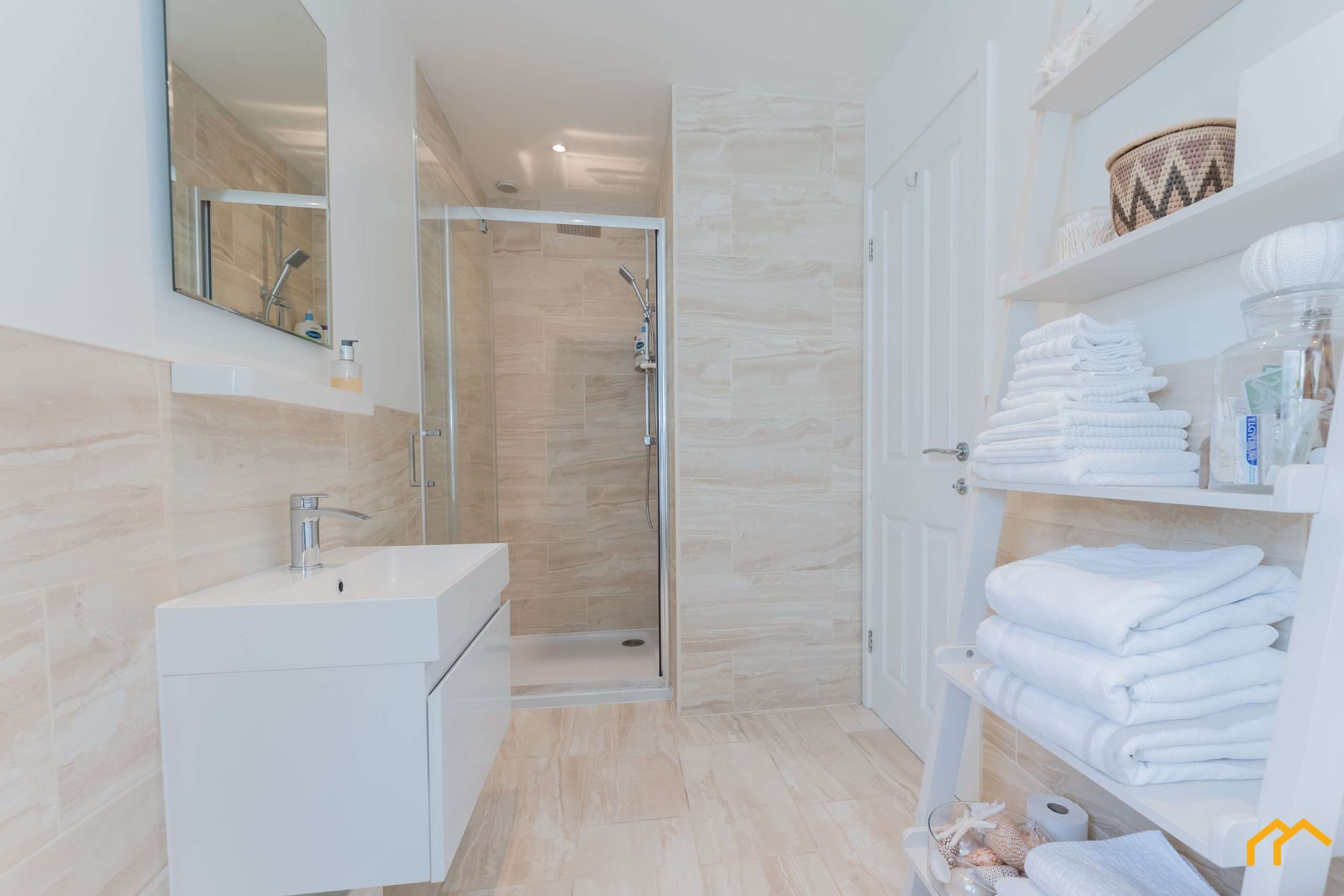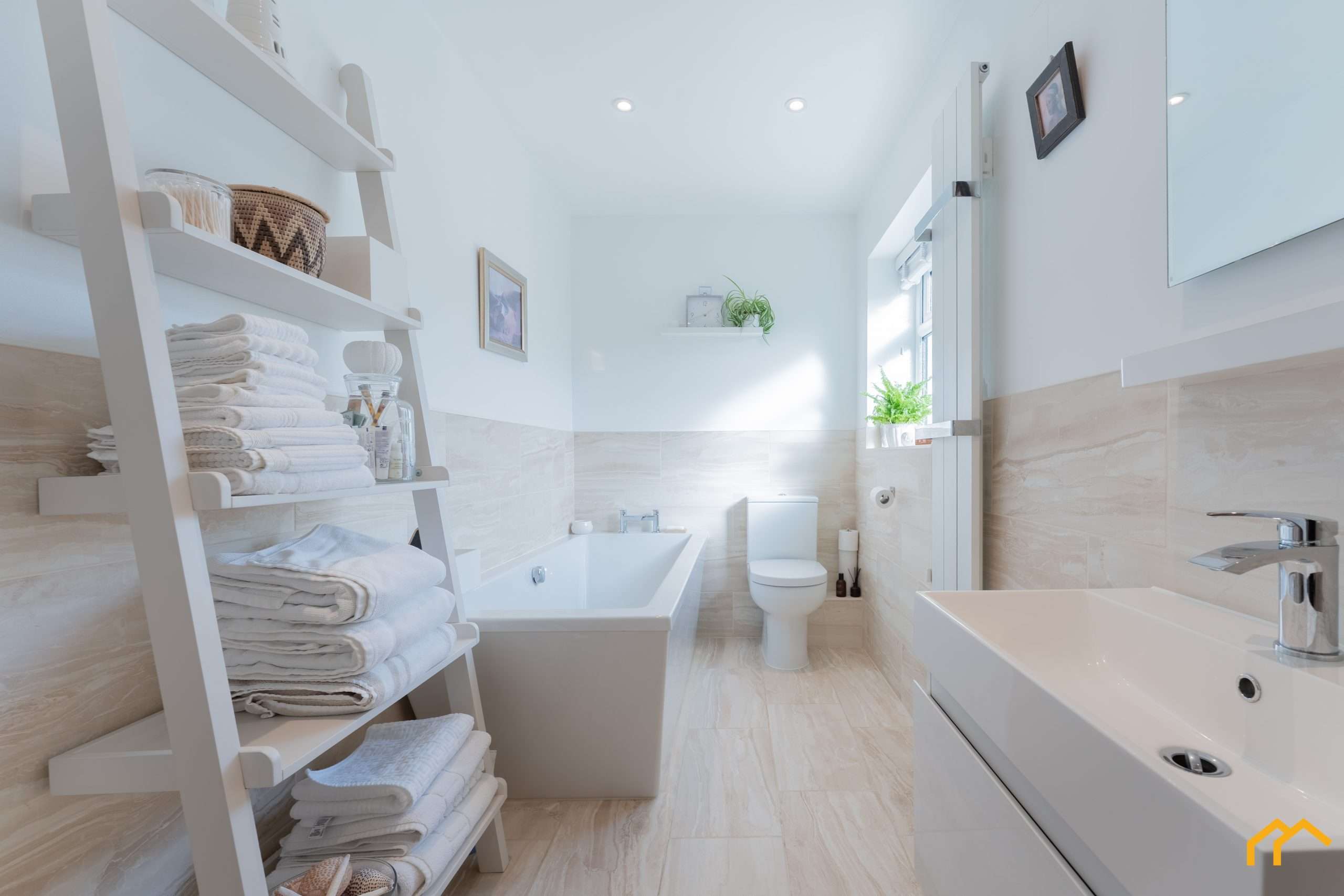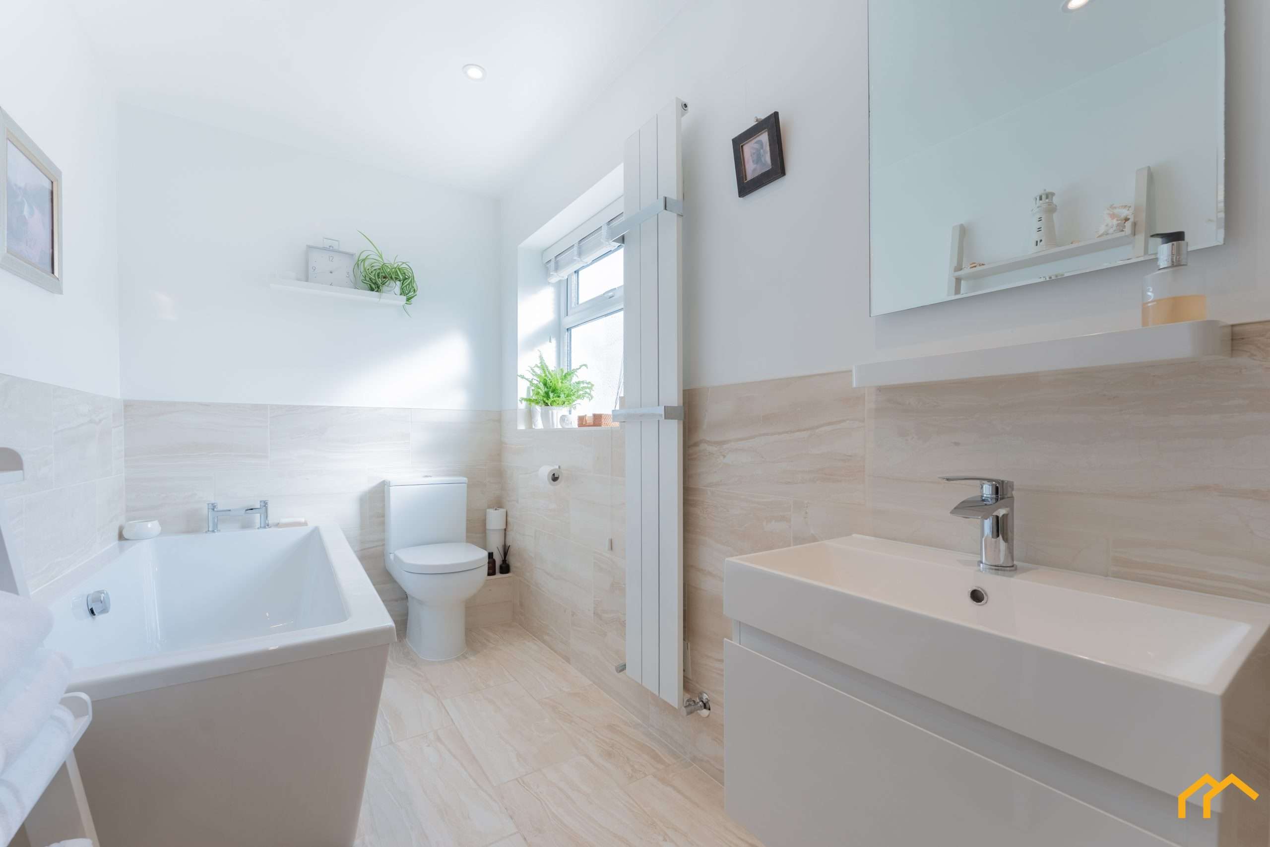 Continuing the high standard of renovation is the family bathroom. The four-piece suite comprises a low-level WC, floating vanity unit with basin, a large square bath and a separate walk-in shower. As with the rest of the property, the bathroom is finished in a neutral colour scheme, with half-height contrasting wall tiles that continue across the floor.