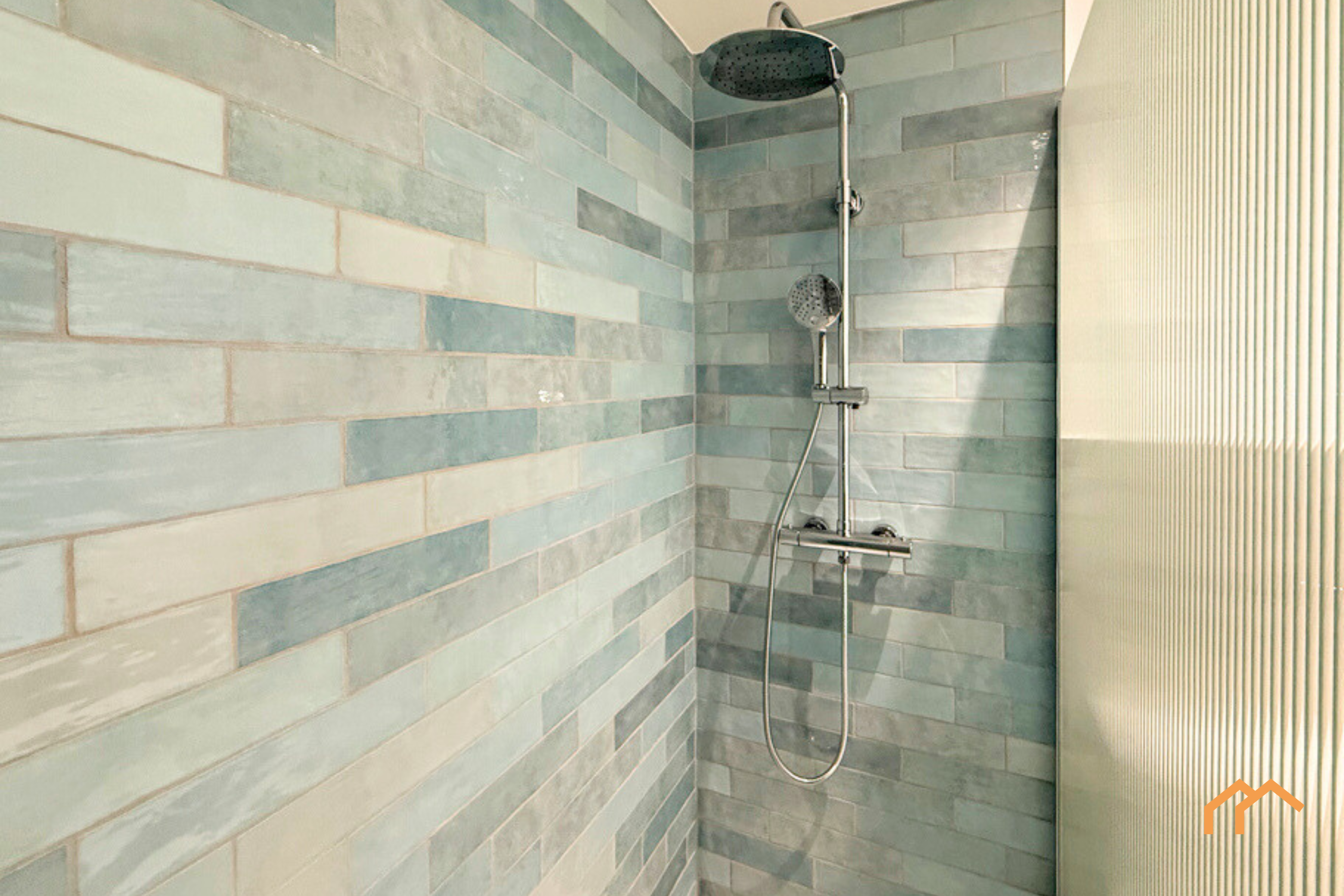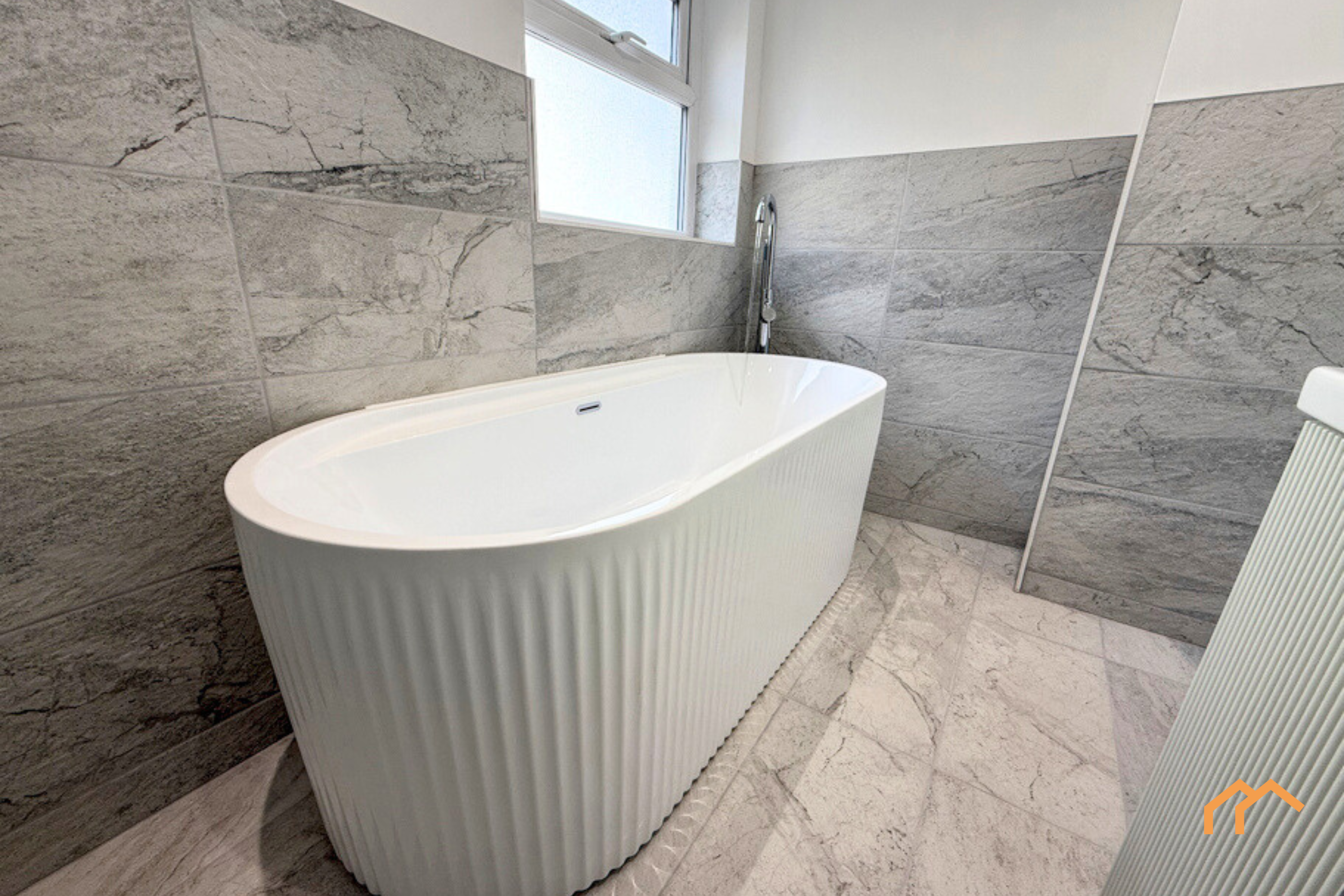 The stunning family bathroom features a fluted, free-standing bath with separate free standing taps. A low-level WC and basin with vanity unit complete the set. The shower area includes a rainfall shower with a fluted shower screen and feature tiling, as well as a heated towel rail. Matching floor and wall tiles complete the natural decor.